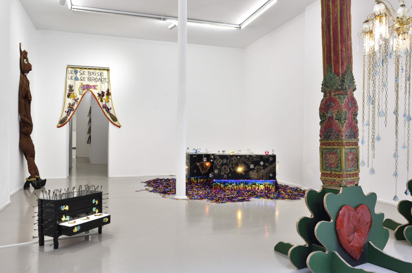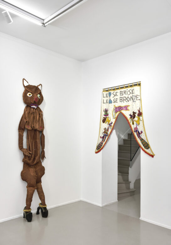 "La nuit de l’ours", 2025 Cuir, céramique / Leather, ceramics 200 x 50 x 35 cm (78 3/4 x 19 5/8 x 13 3/4 in.) — "Le cœur se brise, le cœur se bronze", 2024 Rideau en textile, broderie, strass / Textile curtain, embroidery, rhinestones 150 x 70 cm (59 x 27 1/2 in.)