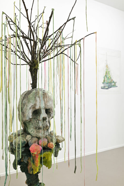 Béton, branches, bois, tissus et peinture à l’huile / Concrete, branches, wood, fabric stripes and acrylic paint 158 x 90 x 115 cm (62 1/4 x 35 3/8 x 45 1/4 in.)