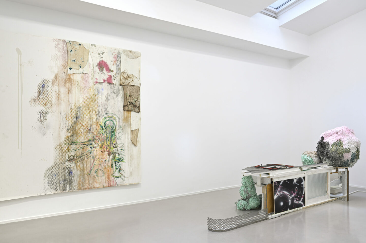 A slightly wilted verdigris green dominates Thomas Buswell’s multicolored work. It appears in dense expressionist strokes, on metal tubes or, more diffusely, on mops. This ambiguous agent seems to leave its invasive mark everywhere. Like those ragwort flowers which, once we have learned to distinguish them from daisies, infiltrate our view of the countryside, along railway tracks. The pigment copper acetate arsenite, known as Paris green because it was used to kill rats in the city’s sewers, poisoned modern painters. Its fumes, as it dried, are said to have caused Cézanne’s diabetes, Monet’s blindness, and Van Gogh’s neurological disorders. This sickly green, repeated and wrung out by Buswell, draws us into a deranged Chthulucene era,1 in which single machines, beings, industrial and natural objects, and waste attempt to form an ecosystem.